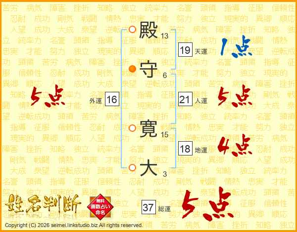 あなたの人生を表す1番重要な運勢です。生涯を通じて影響する総合運となり、主に50歳以降の晩年期に影響を及ぼします。苗字と名前の合計画数。