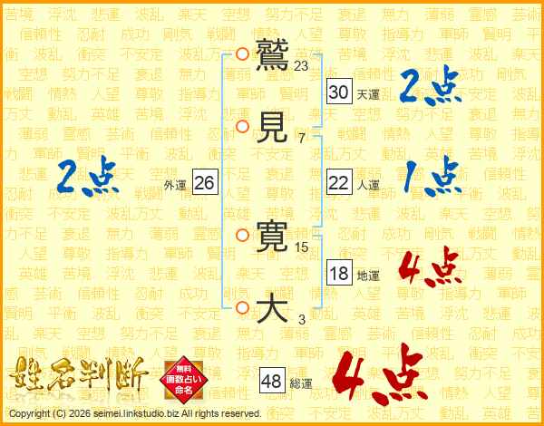 鷲(23画)見(7画) 寛(15画)大(3画)