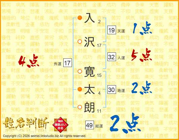 入(2画)沢(17画) 寛(15画)太(4画)朗(11画)
