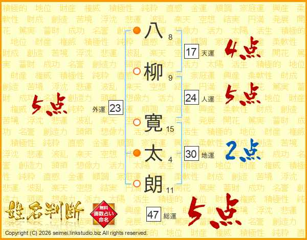 八(8画)柳(9画) 寛(15画)太(4画)朗(11画)