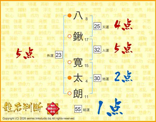 八(8画)鍬(17画) 寛(15画)太(4画)朗(11画)