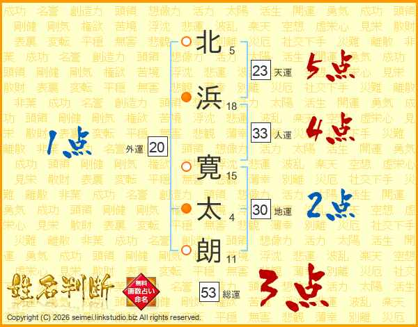 北(5画)浜(18画) 寛(15画)太(4画)朗(11画)