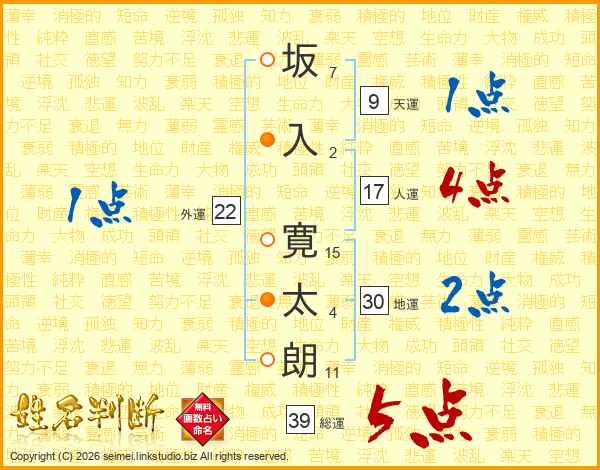 坂(7画)入(2画) 寛(15画)太(4画)朗(11画)