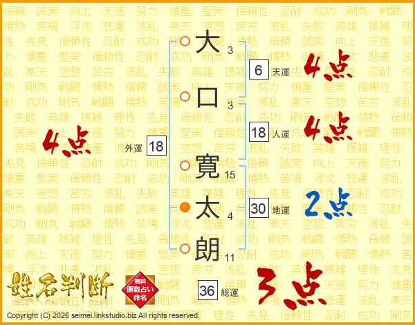 大(3画)口(3画) 寛(15画)太(4画)朗(11画)