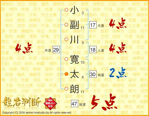 小(3画)副(11画)川(3画) 寛(15画)太(4画)朗(11画)