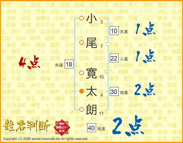 小(3画)尾(7画) 寛(15画)太(4画)朗(11画)