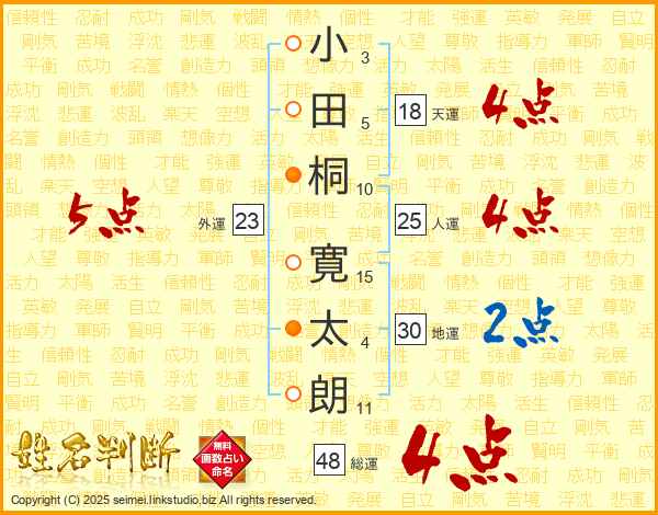 小(3画)田(5画)桐(10画) 寛(15画)太(4画)朗(11画)