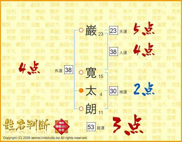 巌(23画) 寛(15画)太(4画)朗(11画)