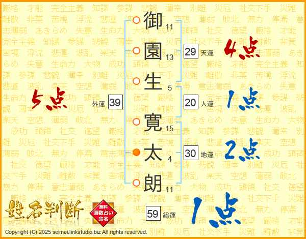 御(11画)園(13画)生(5画) 寛(15画)太(4画)朗(11画)
