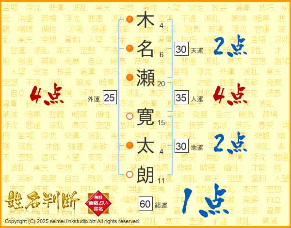 木(4画)名(6画)瀬(20画) 寛(15画)太(4画)朗(11画)