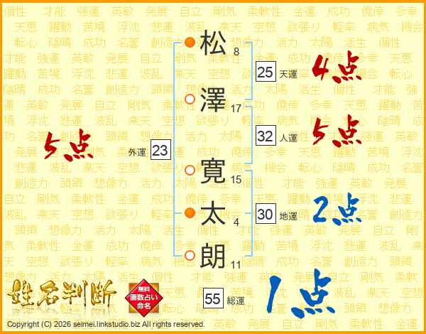 松(8画)澤(17画) 寛(15画)太(4画)朗(11画)