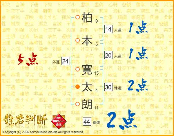 柏(9画)本(5画) 寛(15画)太(4画)朗(11画)