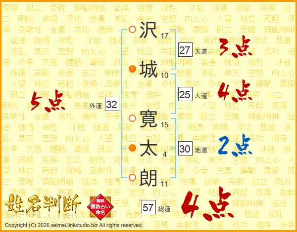 沢(17画)城(10画) 寛(15画)太(4画)朗(11画)