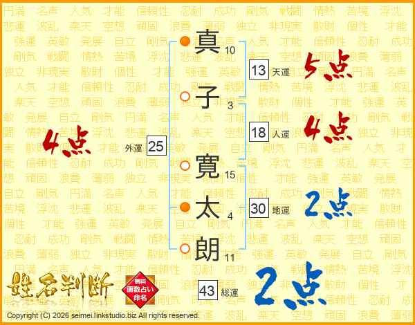 真子寛太朗さんの総運は43画の2点!