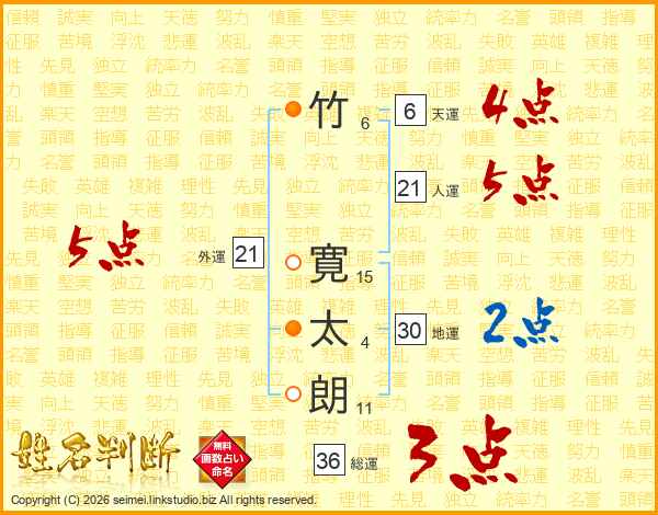 竹(6画) 寛(15画)太(4画)朗(11画)