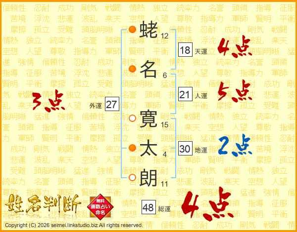 蛯(12画)名(6画) 寛(15画)太(4画)朗(11画)