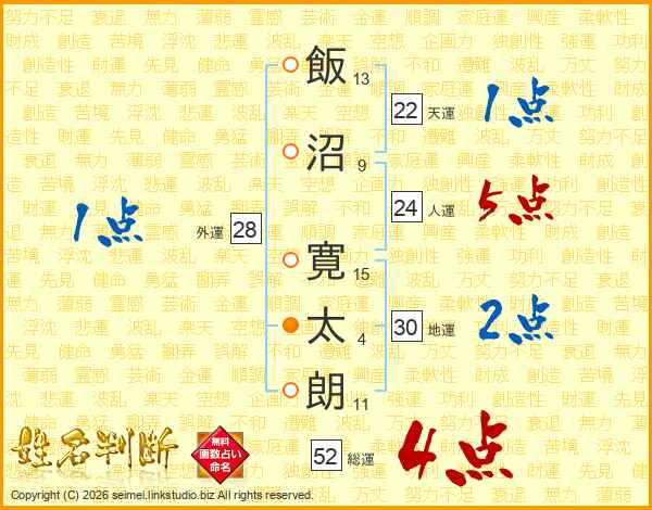 飯(13画)沼(9画) 寛(15画)太(4画)朗(11画)