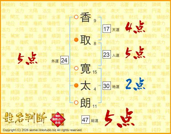 香(9画)取(8画) 寛(15画)太(4画)朗(11画)