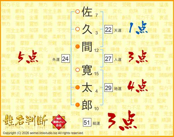 佐(7画)久(3画)間(12画) 寛(15画)太(4画)郎(10画)