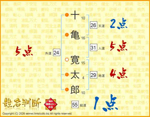 十(10画)亀(16画) 寛(15画)太(4画)郎(10画)