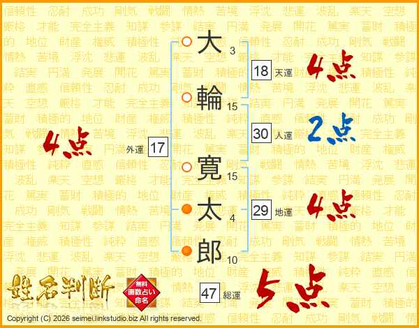 大(3画)輪(15画) 寛(15画)太(4画)郎(10画)