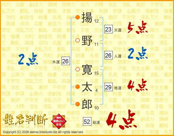 揚野寛太郎さんの総運は52画の4点!