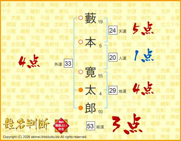 藪(19画)本(5画) 寛(15画)太(4画)郎(10画)