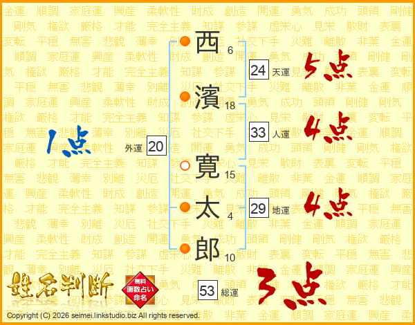 西(6画)濱(18画) 寛(15画)太(4画)郎(10画)