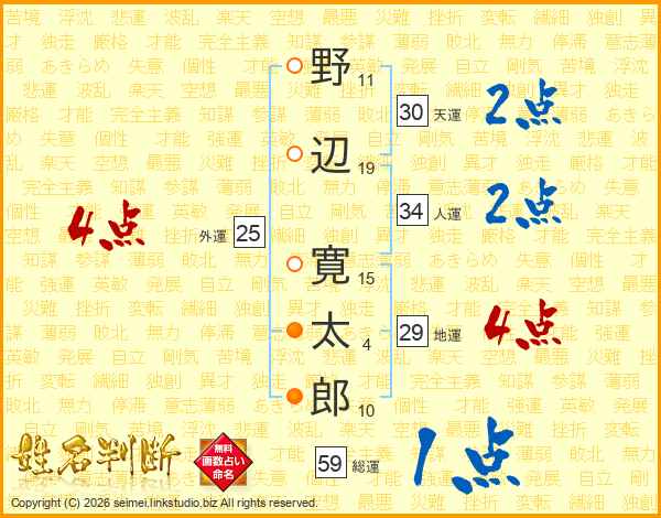野(11画)辺(19画) 寛(15画)太(4画)郎(10画)