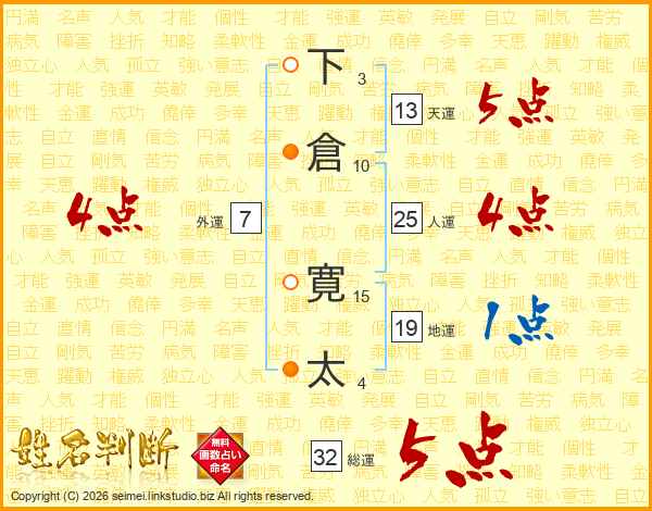 下倉寛太さんの総運は32画の5点!