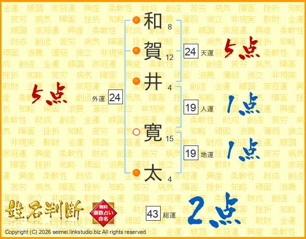 和(8画)賀(12画)井(4画) 寛(15画)太(4画)