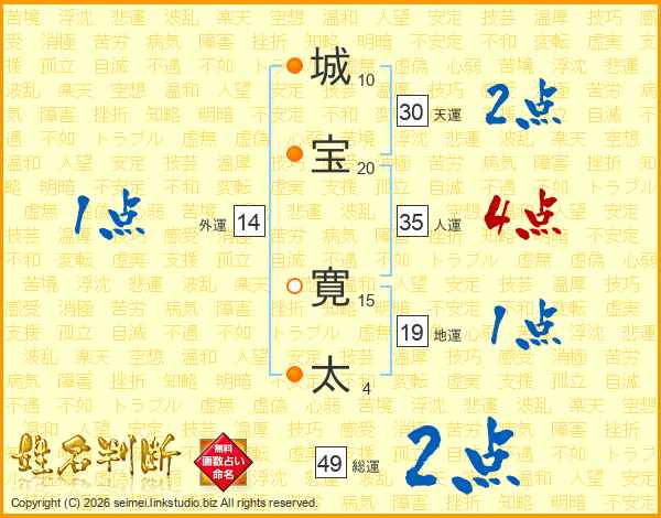 城(10画)宝(20画) 寛(15画)太(4画)