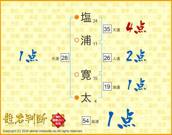 塩(24画)浦(11画) 寛(15画)太(4画)
