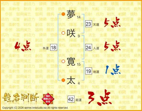 夢(14画)咲(9画) 寛(15画)太(4画)