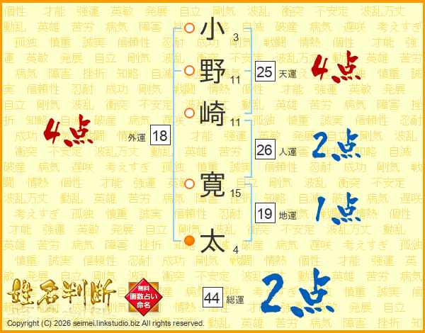 小(3画)野(11画)崎(11画) 寛(15画)太(4画)
