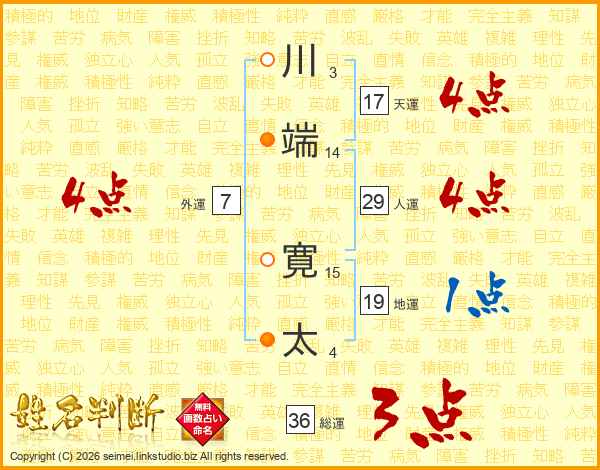 川(3画)端(14画) 寛(15画)太(4画)