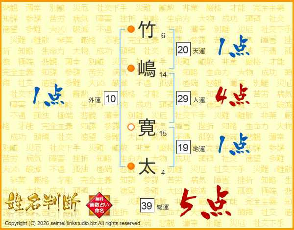 竹嶋寛太さんの総運は39画の5点!