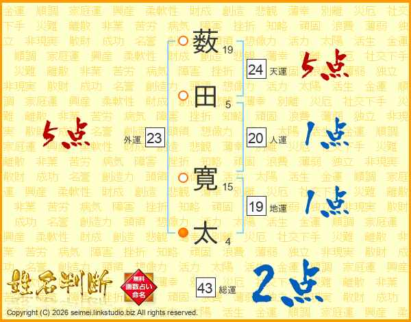 生活面を象徴する運勢です。外部から受ける影響力を表し、結婚運、家庭運や職場、環境への順応性を表します。総運から人運を引いた画数。姓や名が1文字の場合を除く。
