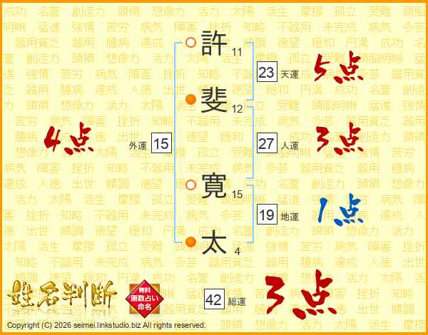 生活面を象徴する運勢です。外部から受ける影響力を表し、結婚運、家庭運や職場、環境への順応性を表します。総運から人運を引いた画数。姓や名が1文字の場合を除く。