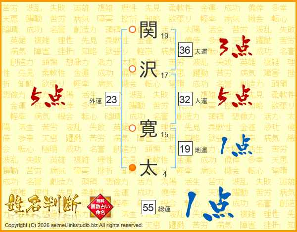 生活面を象徴する運勢です。外部から受ける影響力を表し、結婚運、家庭運や職場、環境への順応性を表します。総運から人運を引いた画数。姓や名が1文字の場合を除く。