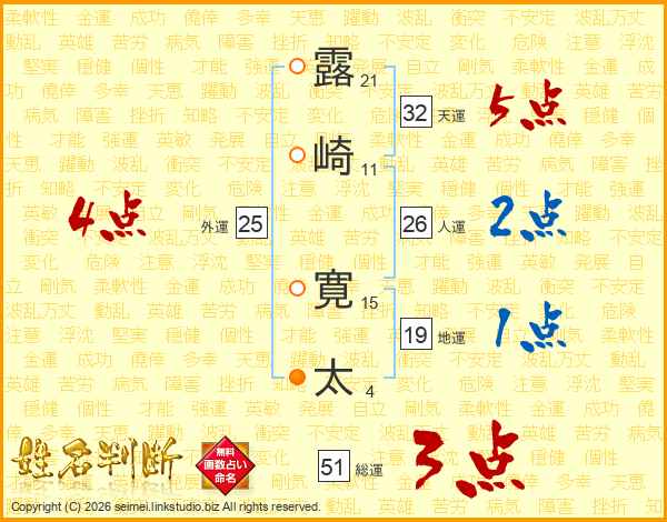生活面を象徴する運勢です。外部から受ける影響力を表し、結婚運、家庭運や職場、環境への順応性を表します。総運から人運を引いた画数。姓や名が1文字の場合を除く。