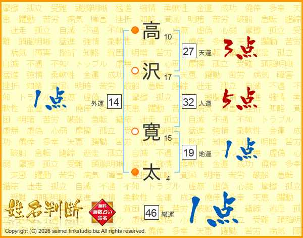 生活面を象徴する運勢です。外部から受ける影響力を表し、結婚運、家庭運や職場、環境への順応性を表します。総運から人運を引いた画数。姓や名が1文字の場合を除く。