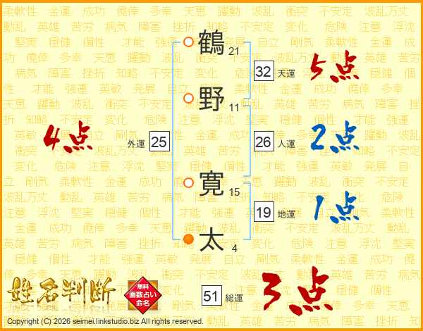 鶴(21画)野(11画) 寛(15画)太(4画)