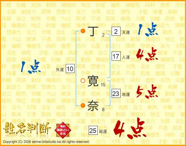 丁(2画) 寛(15画)奈(8画)