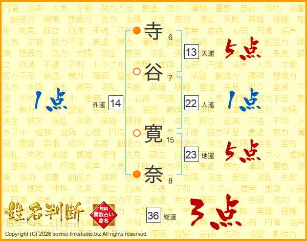 寺(6画)谷(7画) 寛(15画)奈(8画)