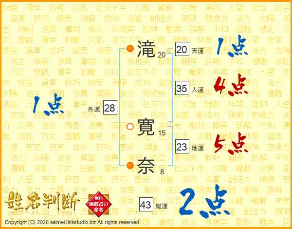 滝(20画) 寛(15画)奈(8画)