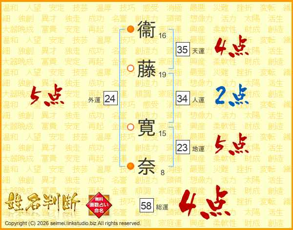 衞(16画)藤(19画) 寛(15画)奈(8画)