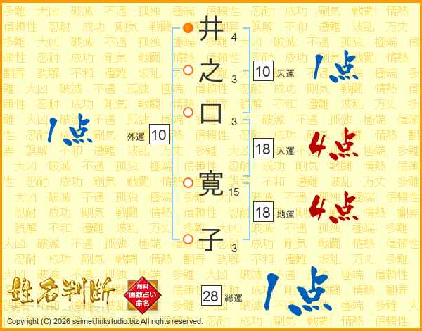 井(4画)之(3画)口(3画) 寛(15画)子(3画)