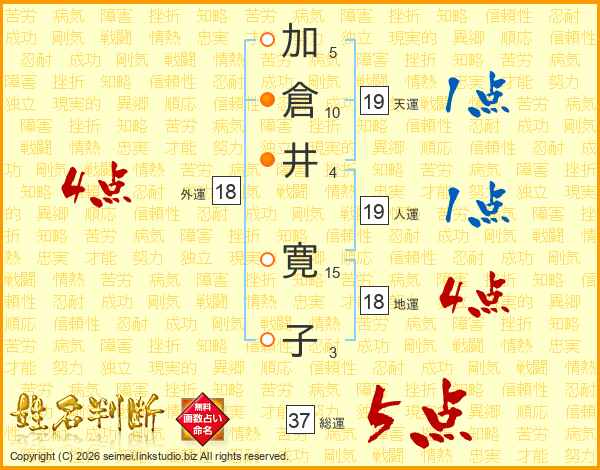 加(5画)倉(10画)井(4画) 寛(15画)子(3画)
