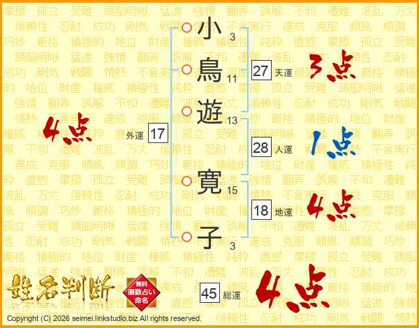 小(3画)鳥(11画)遊(13画) 寛(15画)子(3画)